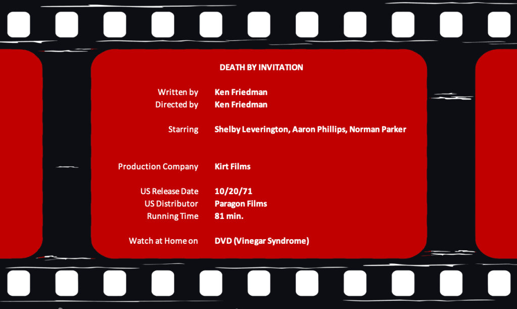Again, I don’t know the significance of Death by Invitation. The only trivia on IMDb is that it was the debut of Leverington, a character actress with 50 credits that worked mostly on TV. Friedman directed only three films, but wrote a handful of studio films in the late 80’s through the early 90’s. It doesn’t even have a Wikipedia page. Nevertheless, I’d like to read more about it and may explore some reference books.
