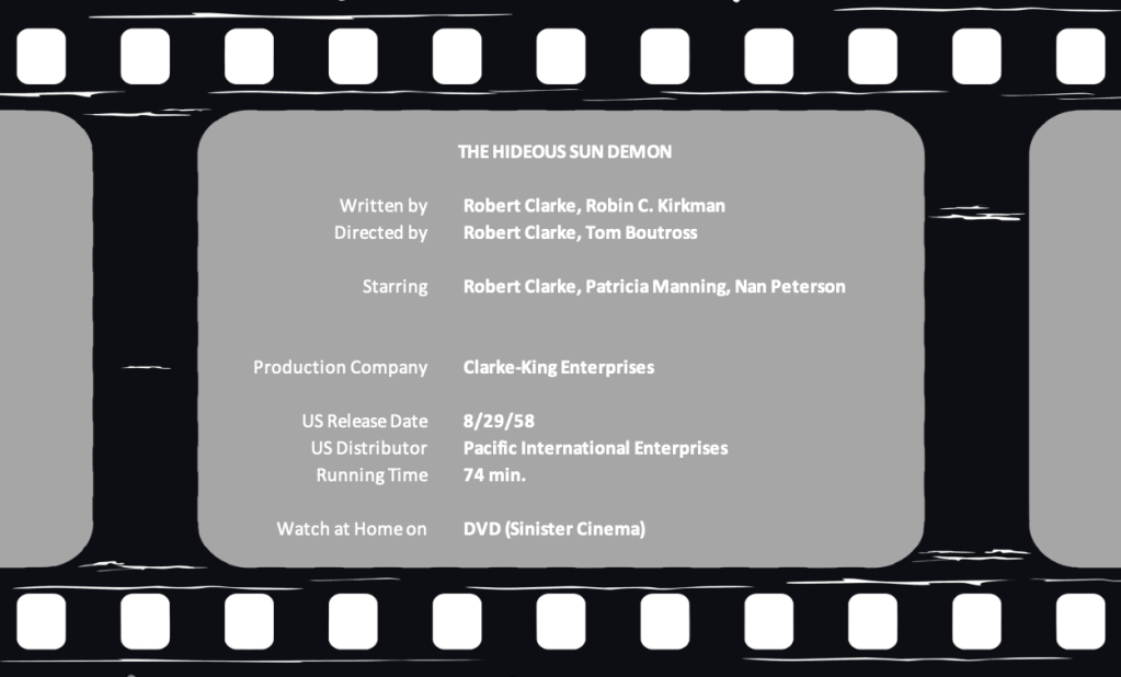 Following the success of The Astounding She-Monster (1957), actor Robert Clarke turned into a one-time director to make The Hideous Sun Demon, filming over the course of 12 weekends, using a cast of friends and family and a crew of USC film students. Yes, there are many comical flaws, some of which I’ll obligingly list below. However, there are also some surprisingly terrific aspects that I’m more eager to share.