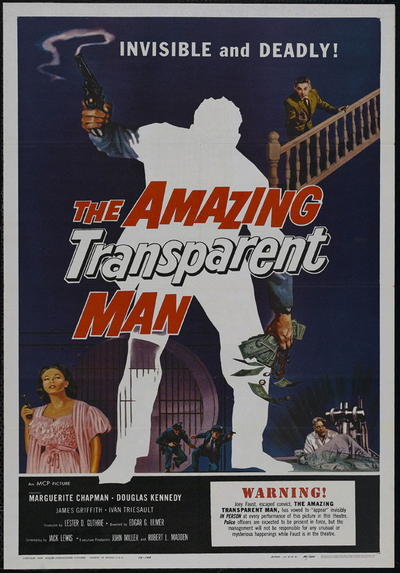 Edgar G. Ulmer directed The Amazing Transparent Man near the end of a 57-year career that arguably peaked earlier with The Black Cat in 1934. He shot the film back-to-back with Beyond the Time Barrier during two weeks in Dallas. That doesn’t mean it’s a bad movie. All things considered, and with only a 58-minute running time, it’s pretty entertaining. Perhaps in less capable hands, it would have been awful.