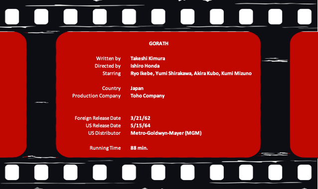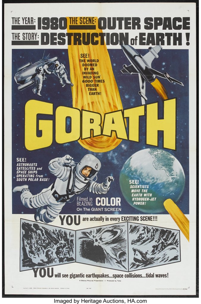 In the far future year of 1979, a rocket from Japan’s space fleet, the Hawk, investigates unusual atmospheric conditions and discovers a magnetic disturbance to which they assign the code name, “Gorath.” 37 days later (because in 1979, we’re able to travel from Earth to Saturn in only 37 days), the Hawk visually identifies a fiery ball hurtling on a collision course toward Earth.