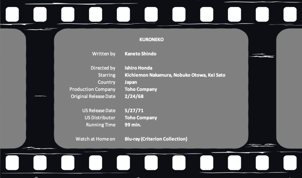 Let’s be honest, the movies I’ve chosen for this year’s Countdown to Halloween may have been fun, but they haven’t exactly been the highest quality. They’ve been B-movies at best, not that there’s anything wrong with that. Kuroneko (1968) makes up for this… and then some. Not only does it have prestige, being foreign and “artsy,” but it is deeply affecting and scary. It’s the best movie I’ve seen in a long time and I can’t recommend it highly enough!
