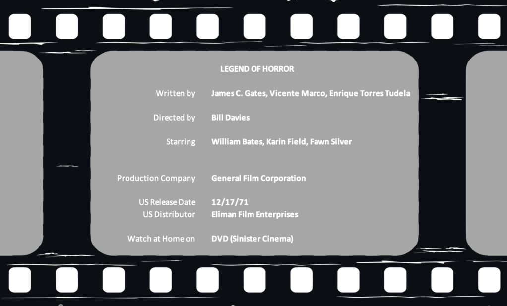 Watching Legend of Horror has left me playing junior detective in its wake. For a movie supposedly made in 1972, it looks as if it’s at least a decade older, and not just because it’s presented in black and white. The credits also refer to flashback footage by another director, Enrique Carreras, when this movie is credited to Bill Davies. Obviously, it’s a Frankenstein monster of a movie, stitched together from multiple sources.