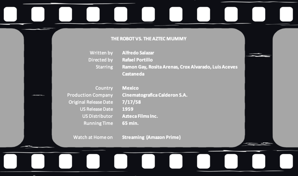 A large part of The Robot vs. the Aztec Mummy (1958), I’m guessing about two-thirds of it, is told in flashback, which makes sense because only about one-third is original material. The flashback sequences are actually recaps of two previous movies: The Aztec Mummy (1957) and The Curse of the Aztec Mummy (1958). It’s an expeditious way to watch a trilogy in only 65 minutes.