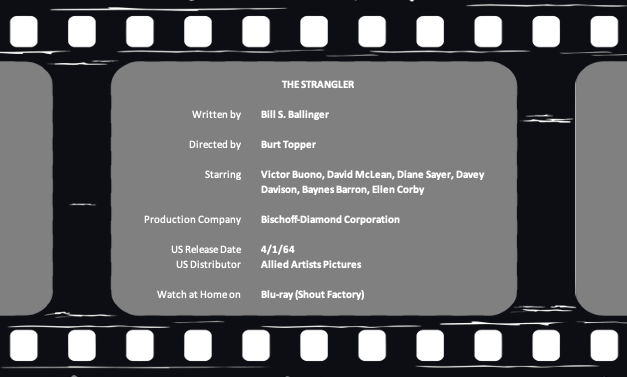 Victor Buono, hot off his Academy Award nomination for What Ever Happened to Baby Jane?, stars as Leo Kroll, who from the very first scene is identified as the titular strangler. This tells us the movie is not going to be a mystery and will probably have very few surprises, if any. True enough, it plays as a crime drama, yet has enough disturbing material to count it as classic horror.
