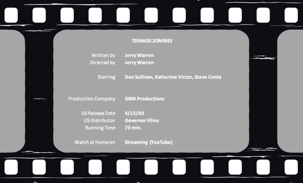 Actually, I wasn’t sure it was a gorilla. Most of the movie is dark and murky. I don’t think we should demand a restoration, though. The more we can see of Teenage Zombies is probably not the better; nor is the more we hear. The score would have us believe the movie is a non-stop thrill ride. Even its dull moments are scored like the survival of the world hinges on the actions of whoever is on screen.