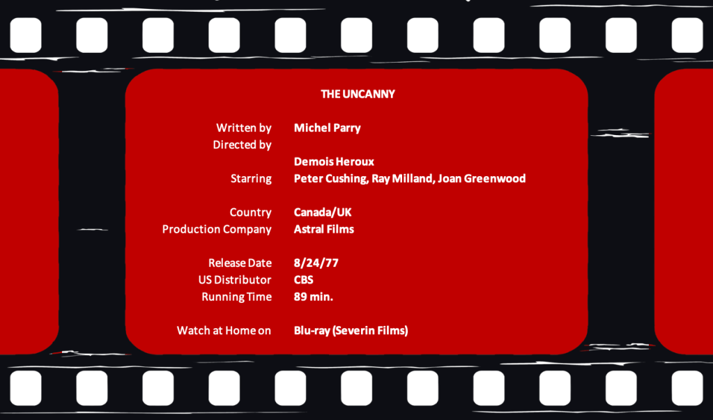 Although one of its producers is Milton Subotsky, it’s not an Amicus Production. Nevertheless, The Uncanny (1977) would fit nicely among the studio’s horror anthologies. A Canadian/British co-production, the movie was made three years after Amicus had transitioned from anthologies to adventure films like The Land that Time Forgot (1974) and At the Earth’s Core (1976.)
