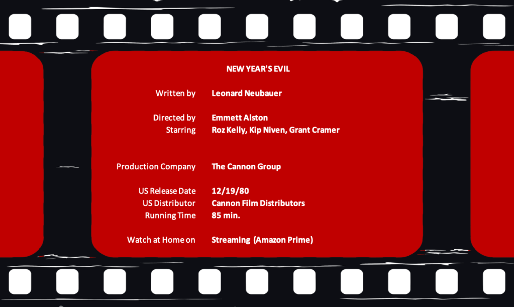 For a movie that reeks of the 1980s, New Year’s Evil (1980) doesn’t feel very authentic. Punk rock fans of disc jockey, Diane Sullivan (Roz Kelly), flood into a New Year’s Eve party that’s airing live over the airwaves, an act that in and of itself seems more commercial than I perceive punk rockers would support. True, I neither was, nor am, a punk rocker; however, I was in my late teens/early 20’s during the 80s and nothing about the movie seems particularly realistic to me.