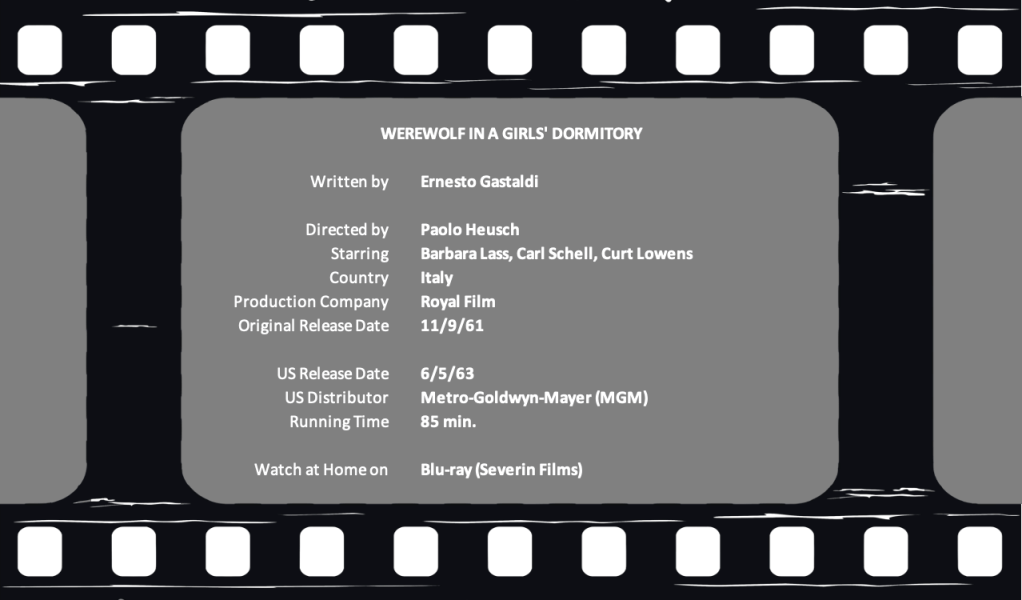 Its title, Werewolf in a Girls’ Dormitory, does the movie no service, other than to place butts in car seats at the drive-in when it was released in 1961 (on a double bill with Corridors of Blood.) As David Del Valle notes in his commentary with actor Curt Lowens on the recent Severin Blu-ray release, Werewolf in a Girls’ Reformatory would be more accurate. However, I favor the original title, Lycanthropus, and wonder how much sooner I would have watched it had I realized it was the same film.
