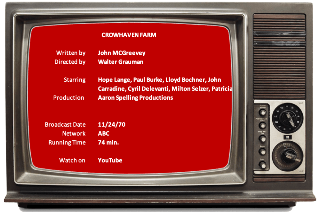 Crowhaven Farm was scripted by prolific television writer, John McGreevey, and directed by Walter Grauman, who directed a 1965 theatrical favorite of mine, Lady in a Cage. Both worked on various TV genre movies and shows. Those are some good credentials; but, to top it off, John Carradine appears in a few brief scenes as a creepy handyman. With his inclusion, I can’t think of anything else it needs.