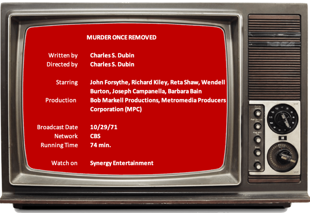 Murder Once Removed (1971) demonstrates why you should never be friends with your doctor. Frank Manning (Richard Kiley) and Dr. Ron Wellesley (John Forsythe) frequent the same parties and are golf buddies, although Manning is blackmailing Wellesley, and Wellesley is plotting to kill Manning. These aren’t spoilers; the movie is not a whodunit, or even a whydunit. It’s a how’d-he-do-it.