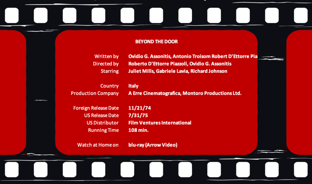 Calling Beyond the Door (1974) an Italian rip-off of The Exorcist (1973) isn’t quite fair. On one hand, that’s exactly what it is; but, on the other, it covers more original ground than I expected it would. Besides, if you believe the argument that The Exorcist isn’t really a horror film at all, then Beyond the Door leaves no doubt that’s exactly what it is. And, if that’s what you want it to be, it has some moments that deliver.