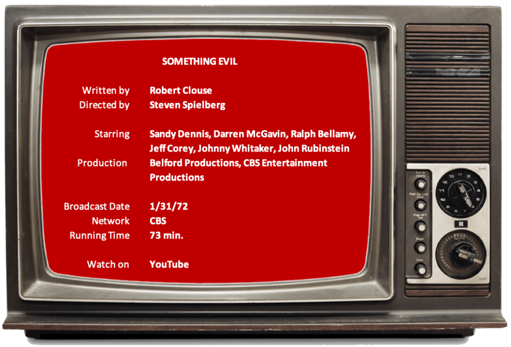 Arriving immediately after Duel (1971), you have to be at least a little disappointed in Steven Spielberg’s next-to-last TV movie, Something Evil (1972.) However, a comparison of the two provides a good example of how a minimalist approach can work perfectly for one movie and not so perfectly for another. As you’ll read, I don’t blame Spielberg. It’s the script by Robert Clouse that’s problematic.