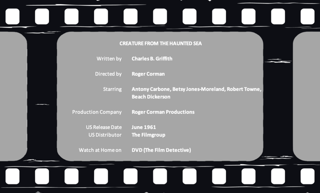 Made closer to Beast from Haunted Cave than the release year indicates, Creature from the Haunted Sea is the last movie Roger Corman directed before solidly landing in Poe territory. It was made before House of Usher (1960), but released afterwards. I’m hard-pressed to think of two movies by the same director that could be any more different.