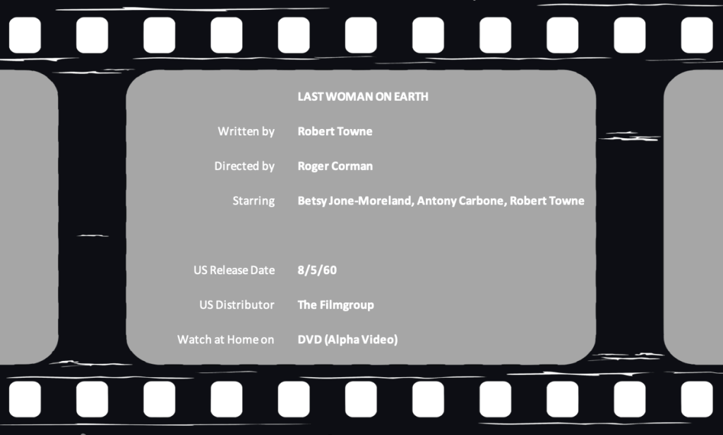 We all know about the big Hollywood names that started their careers with Roger Corman; however, we hear mostly about the actors and directors. Academy Award-winning screenwriter Robert Towne (Chinatown, 1975) also got his start with Corman by writing Last Woman on Earth (1960.) I’ll be darned if his screenplay doesn’t make this low-LOW budget science fiction film a cut or two above the rest.
