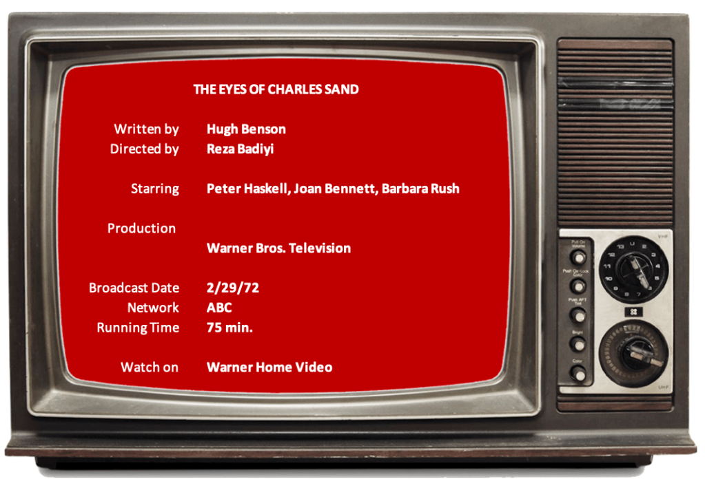 Almost immediately, the movie becomes a standard, yet sometimes twisted, mystery, instead of the horror film it appeared at first to be. I can’t find evidence to prove it, but I’m almost certain that, because of the way the rest of the story unfolds, The Eyes of Charles Sand was a failed pilot for a television series. He’s the reluctant new owner of this power and becomes embroiled in an episodic plot, here one week, gone the next.