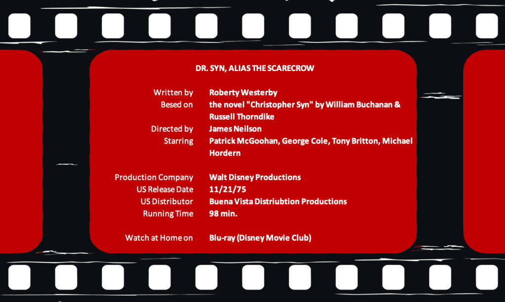Further complicating things is the fact that IMDb shows the running time of Dr. Syn, Alias the Scarecrow to be 98 minutes. The supposedly “full movie” version I found on You Tube ran only 93 minutes. For the purpose of this article, I’m going to assume the YouTube version is the one I saw in 1975. It’s the one I watched to write this.