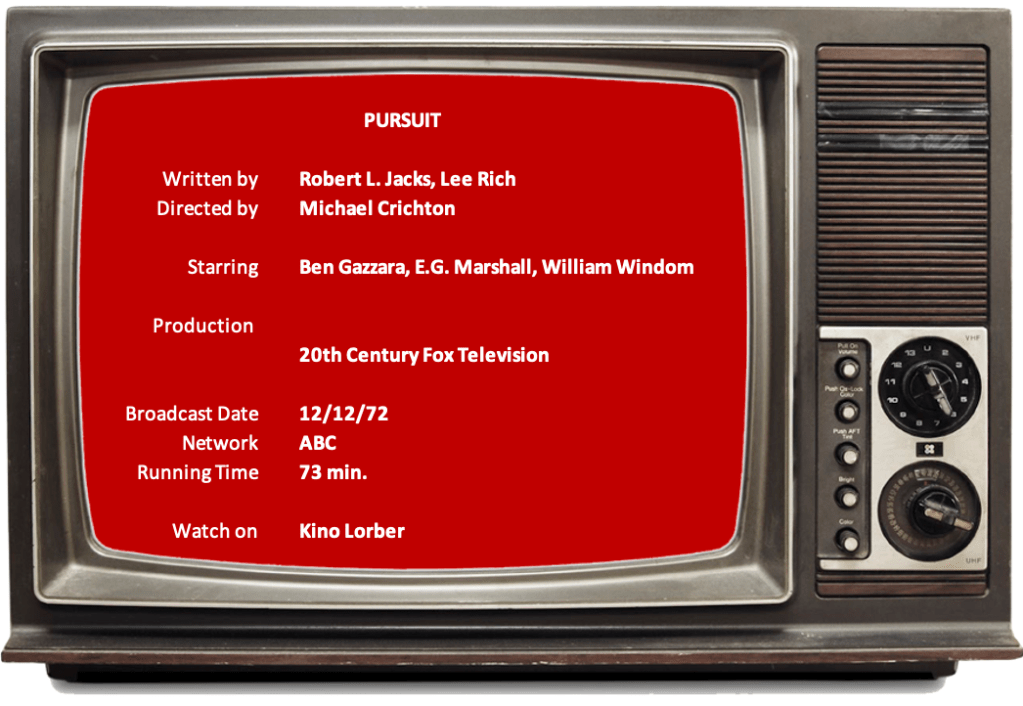 Pursuit is based on a novel called, Binary, by Michael Crichton (Westworld, The Andromeda Strain, Jurassic Park), which was written under a pseudonym while he was still in medical school. Although the producers didn’t feel Crichton had enough experience to write the teleplay, they allowed him to direct it.