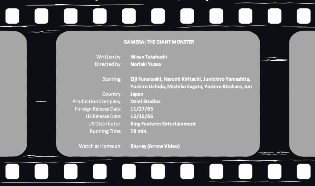 Welcome to the five-week series I’m calling, “GaMAYra.” I have to start by saying that I’ve never (until now) seen a Gamera movie (that I can remember.) However, I was compelled to purchase Arrow Video’s spectacular box set of twelve uncut original Japanese versions of the films, spanning the years 1965-2006. This will be a journey for me, and I’ll be happy to share what I learn. You must forgive me if any of this is remedial information for you. I welcome your feedback along the way. What do I get right? What do I get wrong? Of course, you can’t tell me my opinion is right or wrong, but I don’t want to spread false factual information.