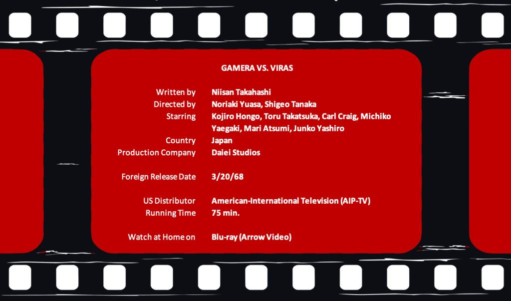 If you find it strange, like I did, that the two boys who lead Gamera into full-fledged children’s movie territory with Gamera vs. Viras (1968) are named Masao and… “Jim,” it’s because Daiei had entered into an agreement with American International Pictures for the next Gamera films to premiere on United States television. As part of this agreement, AIP wanted American actors to share the screen with the Japanese actors. The fact that Maseo (Toru Takatsuka) and Jim (Carl Craig) both belong to a scout troop is the least strange aspect of the production.