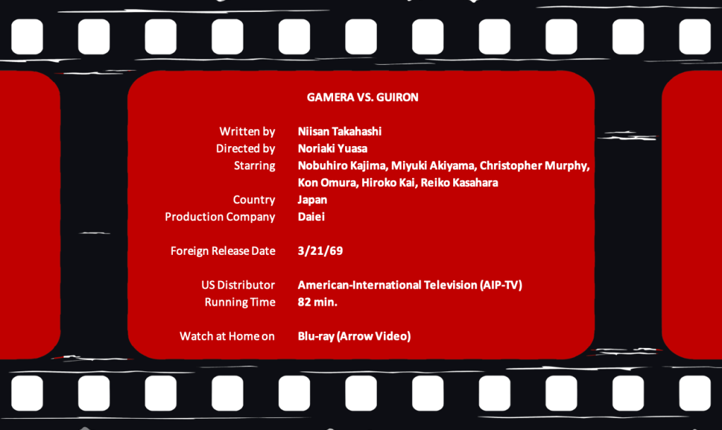 Gamera vs. Guiron is a kid’s movie? Yes, As the series goes on, I’m enjoying each one more than the last. I like this one better than the previous one because the stock footage is used as expository flashback; it doesn’t try to pass as new material. Somehow, they keep sucking me in, striking some kind of chord with me that I didn’t know I possessed.