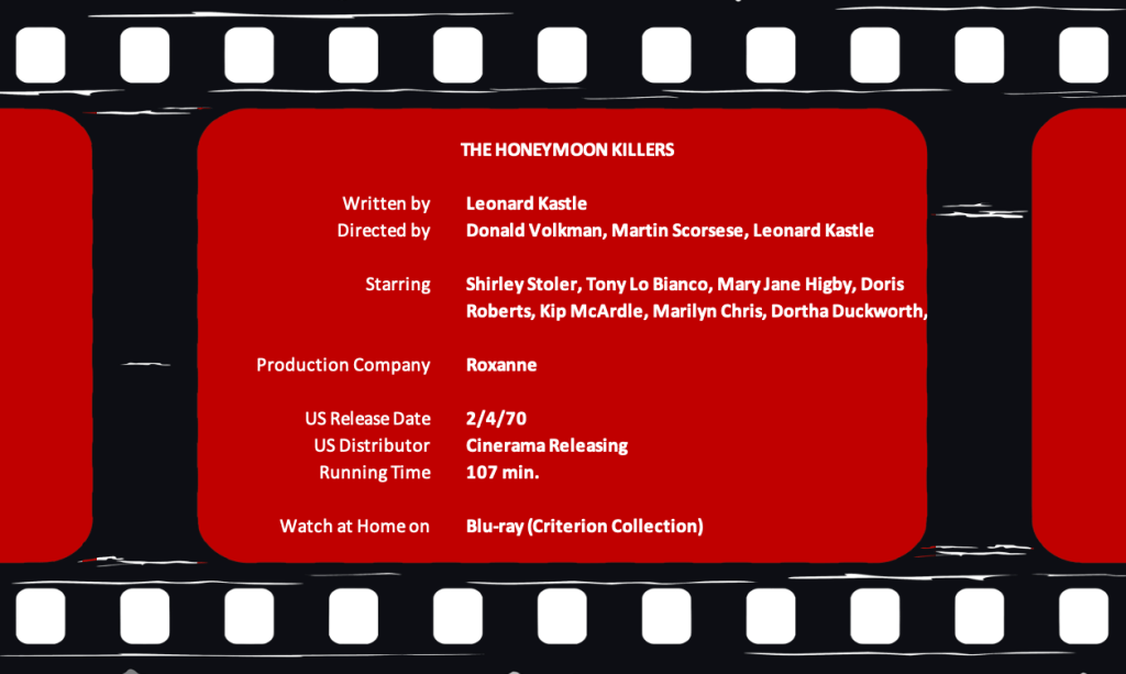 This would have been Scorsese’s second full-length feature… had he not been fired after one week. He was working too slowly and admits he was fired with good reason. He was replaced by Donald Volkman, who was then replaced by Kastle. The Honeymoon Killers would be his only theatrical feature. I don’t know how long Volkman worked on it, but since only a few of Scorsese’s scenes were used in the final film, I think we must credit Kastle for the movie’s style.