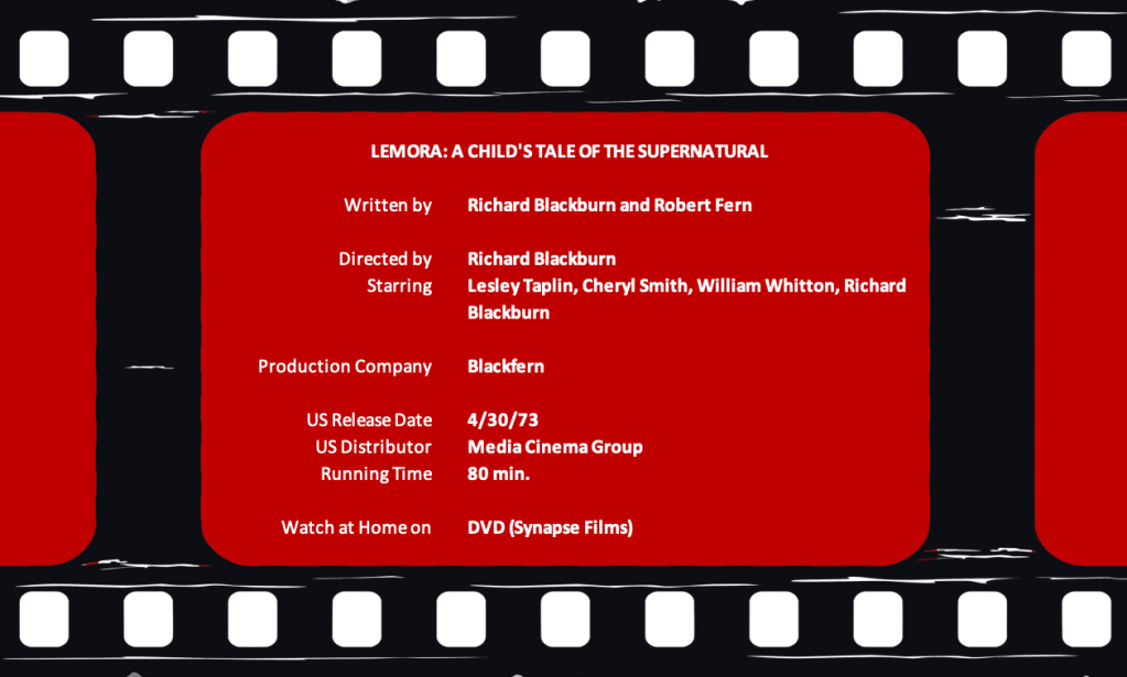When the Video Warehouse in Chanute, Kansas, was one of the locations I managed in the 1990s, I distinctly remember two movies we could not keep on the shelf. These were not blockbuster titles by any means, so it was always odd for me at the time when someone asked about Embrace of the Vampire (1995) and today’s film, Lemora: A Child’s Tale of the Supernatural (1973.) I’ve never seen the former and, until recently, I’d never seen the latter.