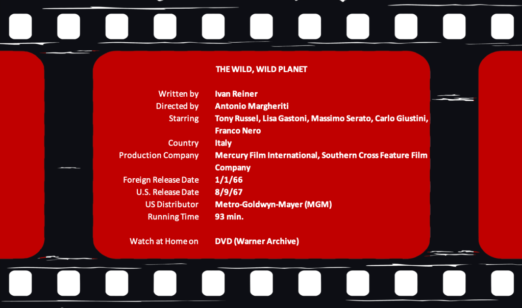 This is the first of four movies known as the “Gamma 1 Quadrilogy” that were going to be made for television but were released theatrically in some countries. They were made at the same time to save money and were released (in Italy, at least) between July of 1966 and January of 1967. I recorded two of the others on TCM (War of the Planets and The Snow Devils) at different times, so I’m going to go out of order for the next few days to write about all three.