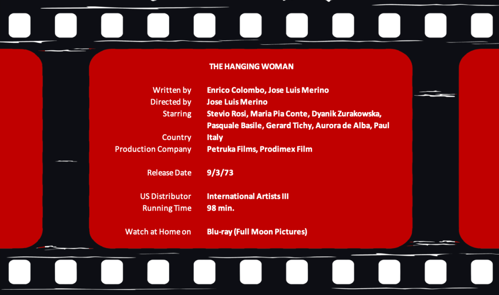 Known by many different names, The Hanging Woman (1973) best represents the movie. The name under which I bought the Blu-ray from Full Moon, Orgy of the Living Dead, does not. Sure, there’s a great quote from the film: