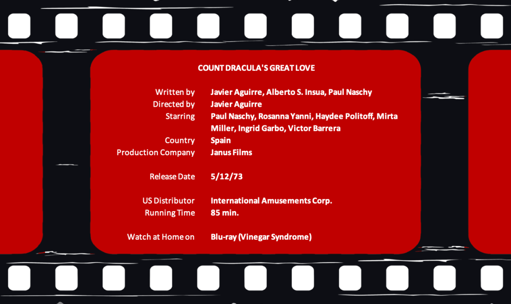 It’s been a good run. I’ve either liked each Paul Naschy film I’ve revisited this month as much as the first time I watched it, or more so. Now, though, I must face the truth. I don’t think I’m ever going to like Count Dracula’s Great Love (1973.) Because of this realization, the movie is probably my greatest disappointment.