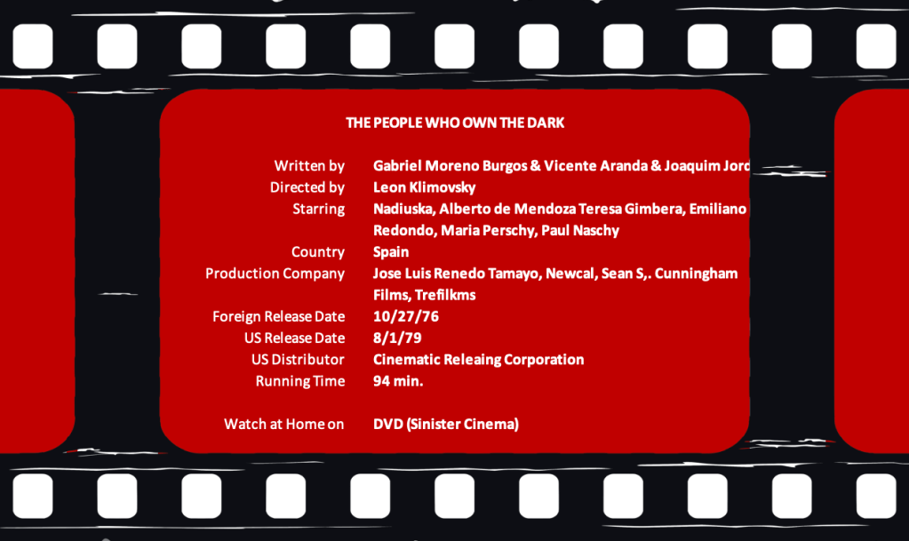 The People Who Own the Dark (1976) is another non-Naschy, Naschy film. That is to say, he appears only on the side of the camera facing it. It’s a bit part, at that, but a pretty good one. The movie itself is tough to rate based on the less-than-prime print of the film I watched. I bet I’d add at least one more Waldemar Daninsky if a few things were clearer for me.