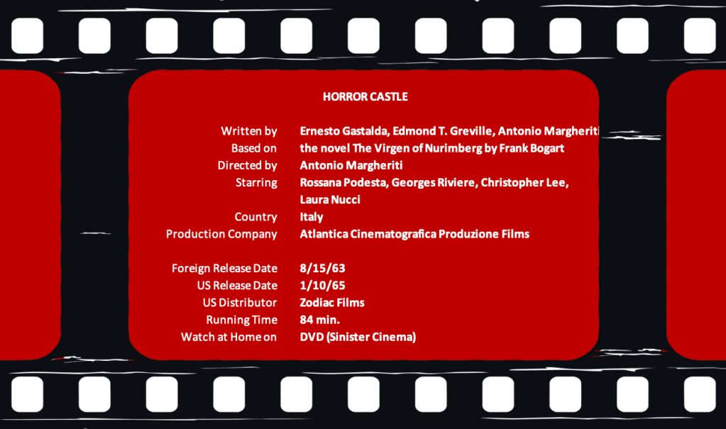 With its plot happening within the span of a couple days, much of Horror Castle, aka The Virgin of Nuremberg (1963), plays like one of those movies that’s supposed to unfold in real time. Counterintuitively, when you think that should make a film more suspenseful, it really just drags it out. If not for its terrific climax, I wouldn’t have been very fond of the pace.