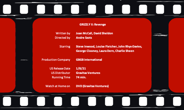 George Clooney, Laura Dern, and Charlie Sheen are the first three victims of the bear in the second scene of Grizzly II. They’re neither seen nor heard from again. I don’t blame Nagy for capitalizing on their participation. It was worth it for me to see them at this stage in their careers. What Nagy doesn’t advertise are the appearances of two other big names: Louise Fletcher and John Rhys-Davies, even though their additional screen time does them no favors. Fletcher is a zombie and Rhys-Davis is a ridiculous caricature.