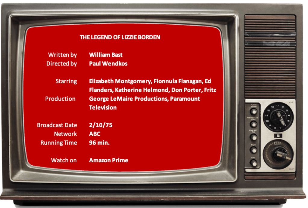 Watching it recently, it holds up incredibly well. A little longer than most of the films in this series (it would have fit a two-hour timeslot instead of 90 minutes), it held my attention as its actual 96 minutes passed quickly. It may help that it’s compartmentalized into a series of “chapters,” each one beginning after a commercial break. After a brief introduction, in which a nosy neighbor knocks on the door and Lizzie (Elizabeth Montgomery) says, “Oh do come in; someone has killed father,” we start a section called, “The Crime.”