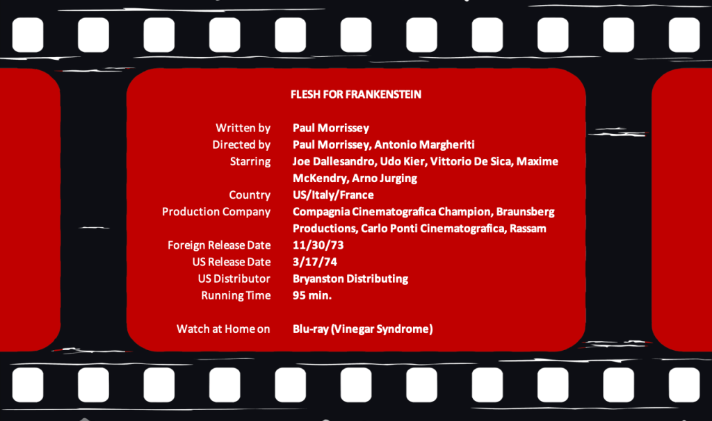 Thanks to Rod Barnett and his podcast, The Bloody Pit, I finally took a plunge into the gory guts of Flesh for Frankenstein (1973.) Both it and its companion film, Blood for Dracula (1974), have always hidden deep in my watch list, mostly due to fear of what I might find. If I found them. Rod and his delightfully garrulous guest, Mark Maddox, convinced me not only that the former would be accessible, but that the time had come to watch it. I was not disappointed.