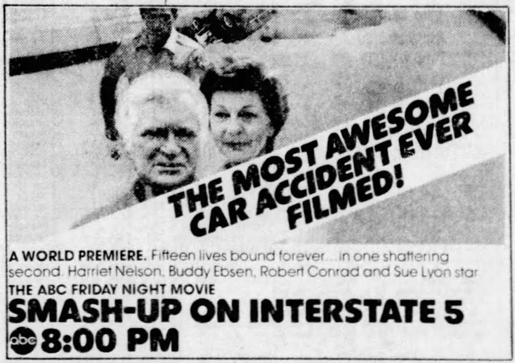 With Independence Day approaching, it’s coincidental that this week’s 1970’s TV movie is Smash-Up on Interstate 5 (1976.) It depicts a 39-vehicle pile-up on the freeway on July 4. The film is bookended with some decent crash footage; however, as Sergeant Sam Marcum (Robert Conrad) of the California Highway Patrol narrates at the beginning, the story is really about the people involved in the accident and what brought them to this specific place and time.