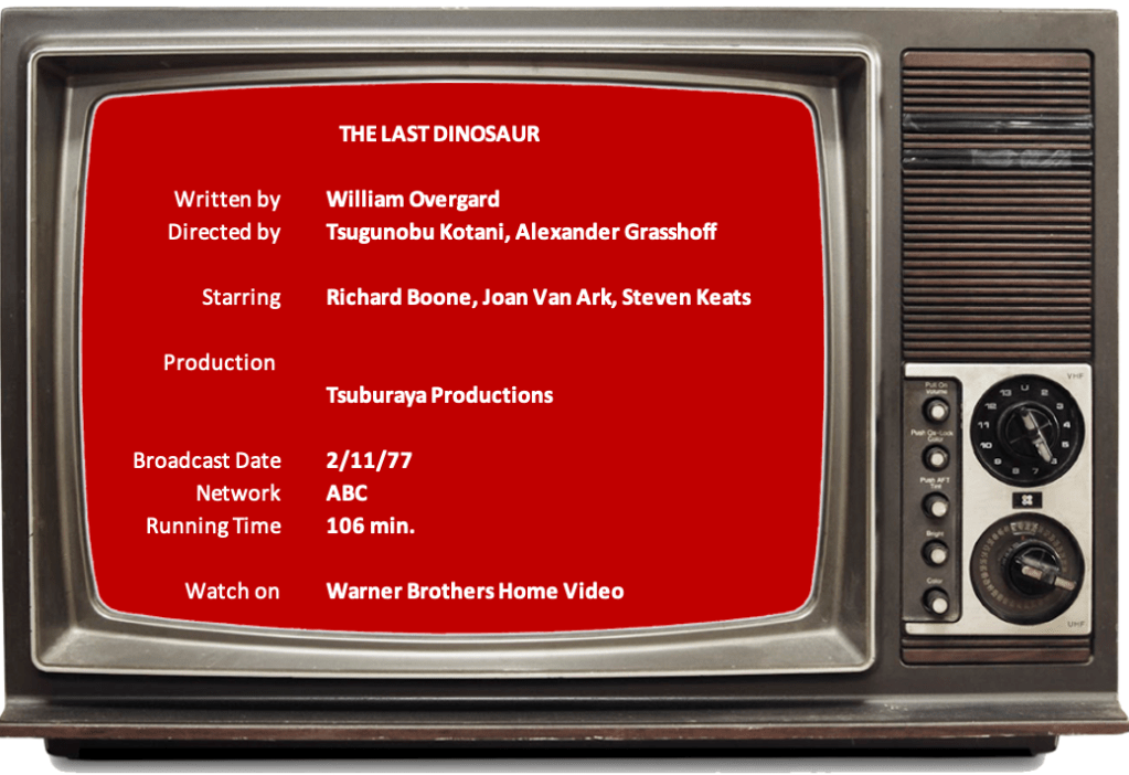 During The Last Dinosaur (1977), especially since it features more than one prehistoric monster, I kept thinking it was Masten Thrust Jr. (Richard Boone) who was the titular character. He’s a big game hunter and “richest man in the world,” according to Newsworld Magazine, who has run out of challenges. While drilling for oil under the polar cap, one of his crews discovers a land that time forgot and its one survivor, Chuck Wade (Steven Keats), claims to have seen a Tyrannosaurus rex up close and in person.