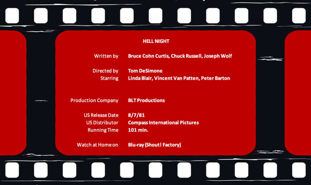 All these years and I’d never seen Hell Night (1981.) I’m not going to say it was a revelation when I finally watched it; however, I will say I enjoyed it much more than I ever anticipated. It’s a typical Slasher, which is to say it’s imperfect, but there are enough interesting things about it that make me believe I’ll watch it again and, perhaps, purchase the Blu-ray.