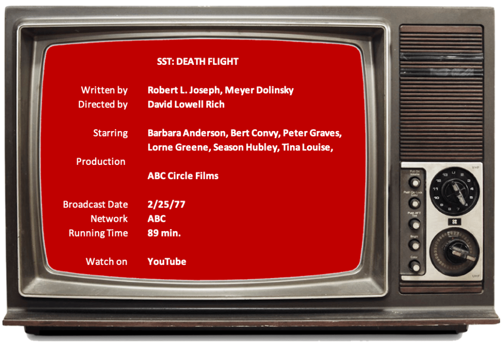 We’ve seen a lot of all-star casts in these 70s TV movies (as well as the big screen disaster films of the 70s.) Truly, I think SST: Death Flight (1977) has the most all-star cast of all of them. The difference is, though, that many of the familiar actors have bit parts. They don’t each have a subplot that would cause the movie to crash, pun intended.
