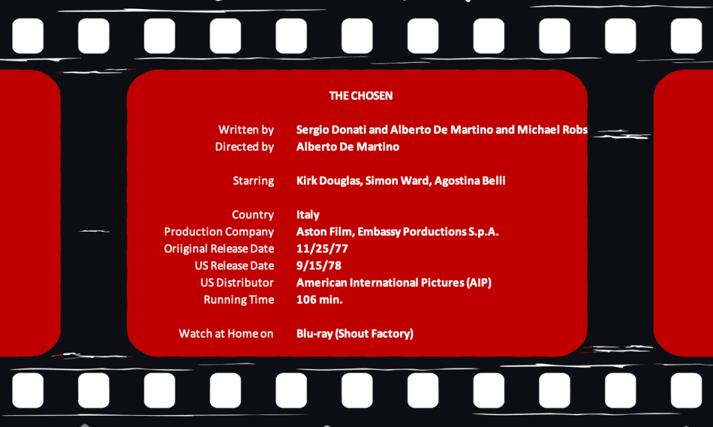The Chosen, the American International Pictures U.S. version, is a bad alternative title. The trailer for it assumes you can’t discover plot points for yourself and spoils the mystery of the film. On the other hand, it emphasizes a connection to The Omen that may not have been intended, but probably was. Holocaust 2000 is a better title, although I don’t know where the number comes from. If it’s the year, “the future” isn’t a part of the movie.