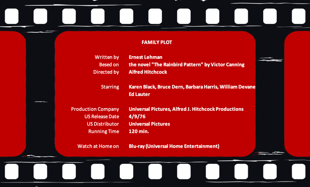 Instead of Hitchcock, let’s talk about the screenwriter, Ernest Lehman. He’s as famous as Hitchcock for his corner of the movie business, having written The King & I, North by Northwest, West Side Story, and Who’s Afraid of Virginia Woolf? I’d scrutinize Family Plot more from the circumstances of the story and character interactions than I would from the direction.