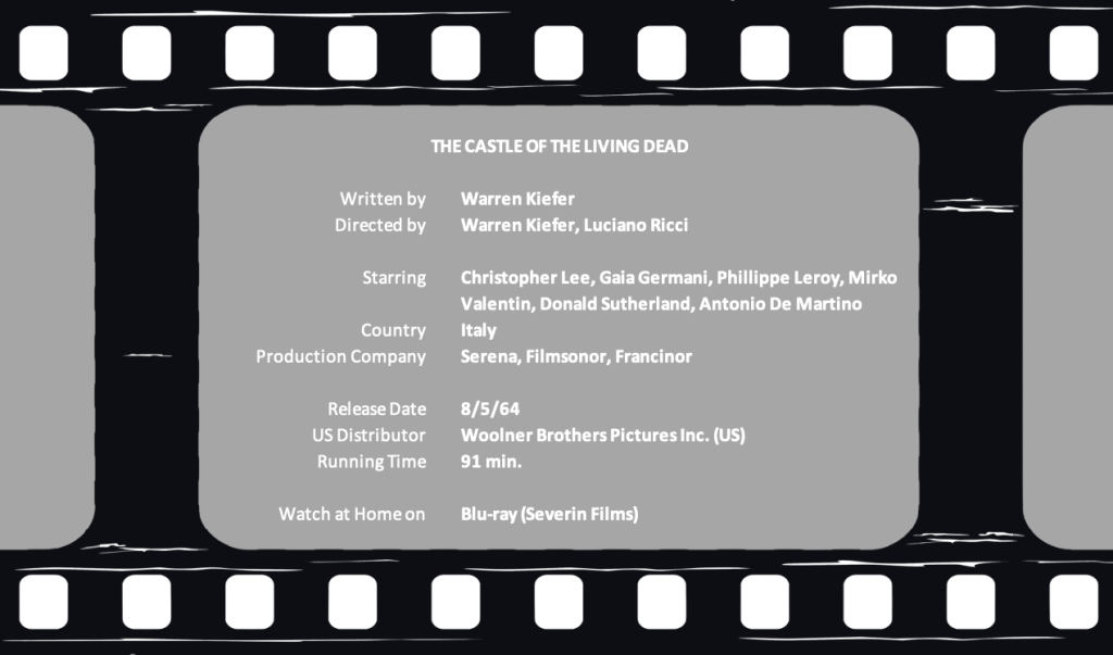 There are a number of very interesting things about The Castle of the Living Dead (1964), but they don’t add up to a pleasurable experience for me. I sat watching, occasionally smiling or checking IMDb because of something familiar, but I was otherwise uninterested and, quite frankly, a little bored with the overall film.