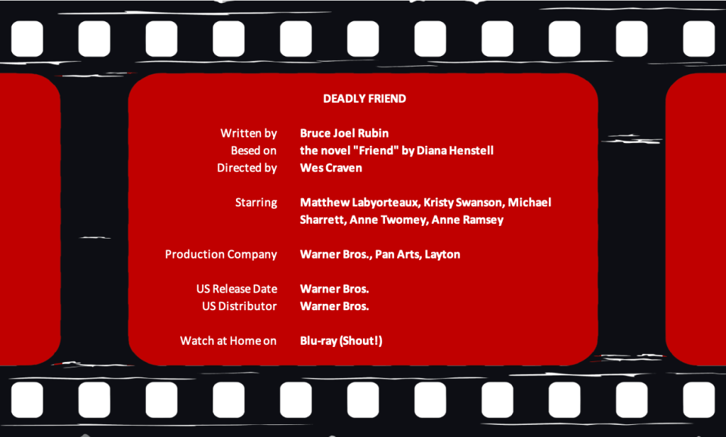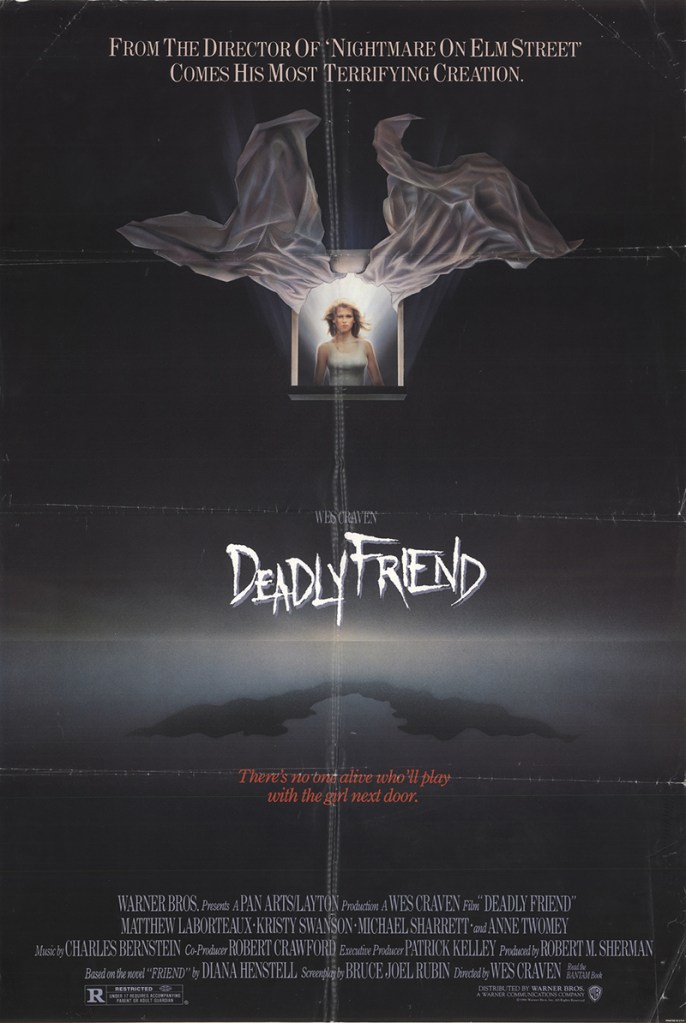 During my research, I learned that director Wes Craven was not happy about the way Deadly Friend turned out and he disowned it. What’s funny is that the scenes I enjoy most are the ones Warner Bros. ordered as reshoots when test audiences didn’t get what they expected. He wanted a Starman (1984)-like romance between Paul and Samantha that was barely horrific at all. Warner Bros. wanted more of another film from that year: A Nightmare on Elm Street.