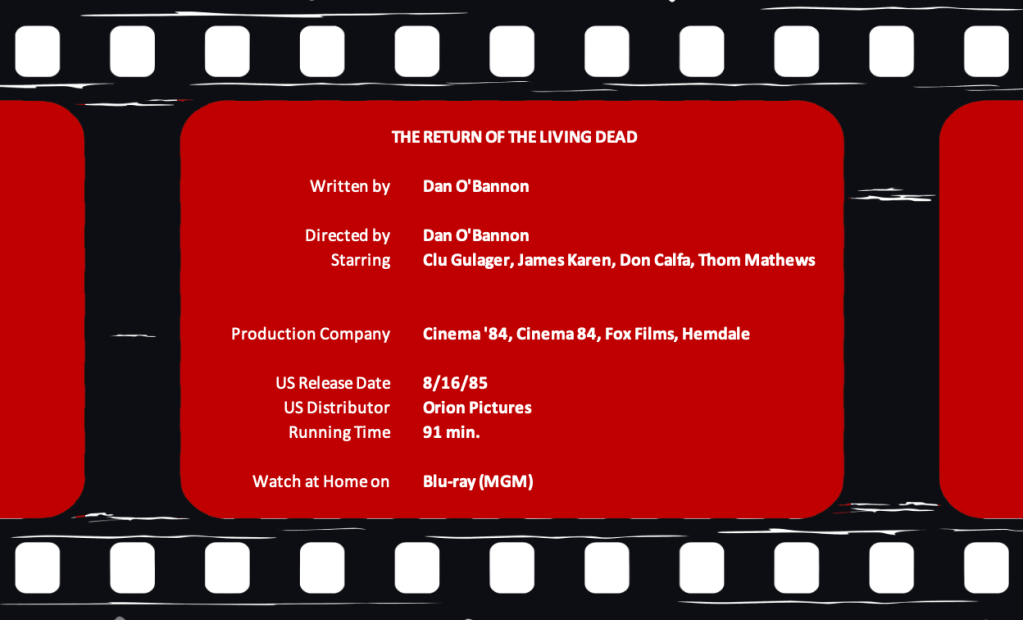 All good things must come to an end. Be careful what you wish for. I jinxed it. Insert the expression of your choice. The point is, after singing praises of mid-1980s horror films that I originally disliked, then rewatched and enjoyed, here comes The Return of the Living Dead (1985.) For me, this was the ultimate test… a film so beloved by so many. If I didn’t like it this time, it had to be me.