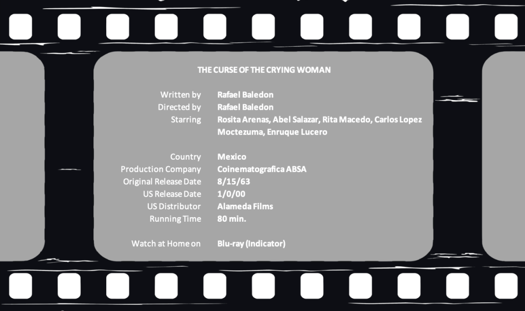 Released in 1963, two years after production was completed, The Curse of the Crying Woman, is the fourth Mexican horror film dealing with the subject of La Llorona, “the crying woman” or “the wailer.” However, it’s the furthest removed from the original legend of a vengeful ghost that roams near bodies of water mourning the children she drowned. There’s neither water nor children here; however, a “modern day” witch attempts to bring the deteriorated corpse of the woman back to life.