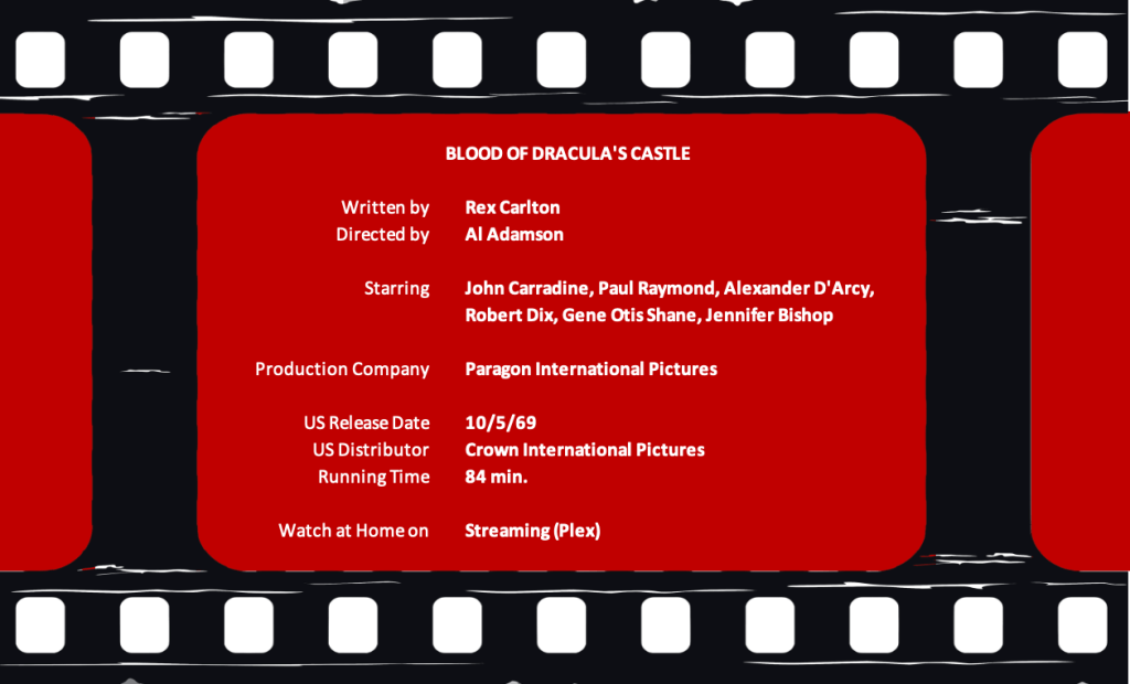 As much as I struggled to complete watching Blood of Dracula’s Castle (1969) and as many problems as I found with it while doing so, it’s still a masterpiece compared to Al Adamson’s (popular-with-everyone-but-me) Dracula vs. Frankenstein (1971.) Repeated attempts to appreciate that one have failed, but with only one viewing, I kind of enjoyed this one.
