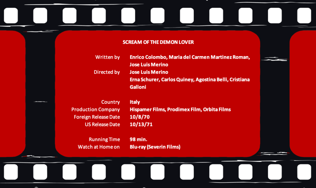Enrico Colombo and Jose Luis Merino also wrote The Hanging Woman (1973), featuring Paul Naschy, which Merino also directed. Both have similarly complicated plot points, but I enjoy that one slightly more than Scream of the Demon Lover. Merino also directed more Robin Hood, Zorro, and Tarzan movies than horror films, indicating he might favor action at the expense of story, which in turn might explain this valiant attempt, but ultimate disappointment.