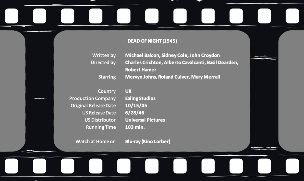 There weren’t many horror films produced in Great Britain during World War II; however, Ealing Studios went horror-adjacent with one of the earliest anthology films, Dead of Night (1945.)