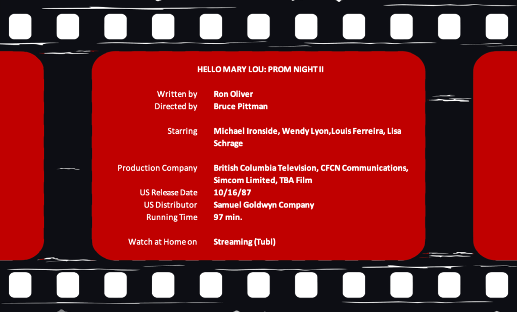 During the Countdown to Halloween, there’s usually one movie that catches me by surprise. This year, it’s one I would never have imagined, one I can hardly believe I enjoyed so much: Hello Mary Lou: Prom Night II. No, it’s not really a sequel to Prom Night (1980.) In fact, I think branding it as such hurts the movie. That’s why I’ve never watched it all these years.