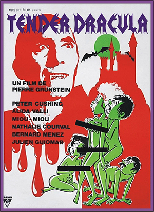 The poster for Tender Dracula (1974) aka The Big Scare, gives us a good idea about how conflicted the movie is going to be. Drawn with dripping red blood in the background is a gorgeous image of Peter Cushing baring fangs as a vampire (perhaps the titular Dracula,) yet in the foreground are green caricatures of four naked people cowering in fear.