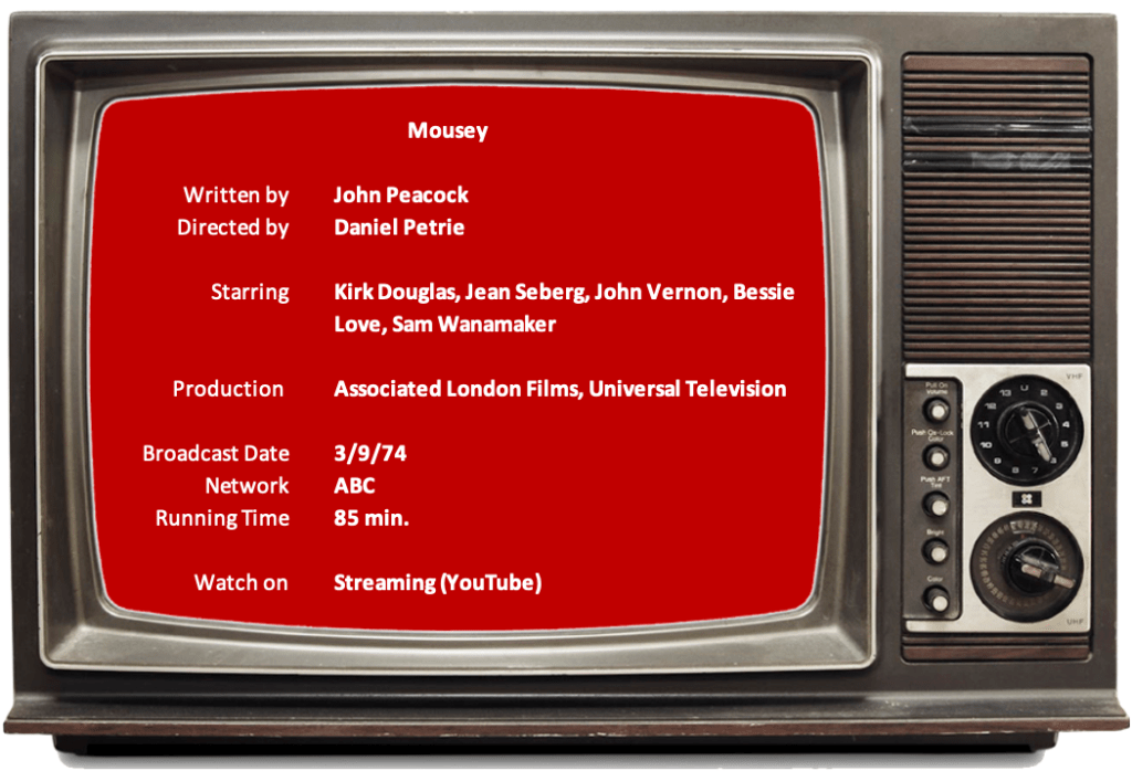 Mousey (1974) doesn’t feel like a made-for-television movie. In fact, it was released theatrically in the UK, Australia, Italy, and Denmark, where it was known as Cat & Mouse. I couldn’t find much about its origins, but there’s got to be a story to explain the melting pot of production contributors.